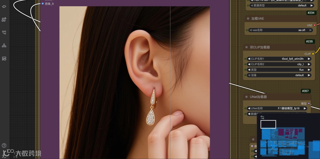 为确保图像质量,需定制化训练LoRA模型并设计高阶Flux工作流。相较Nano Banana等通用模型,高阶工作流在细节处理上更具优势,如耳钉佩戴位置精准、纹理清晰自然。