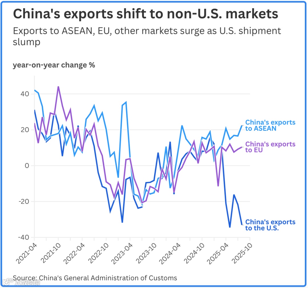 受特朗普时期贸易政策影响,中国对美出口持续承压。海关数据显示,今年前8个月,中国对美国出口同比下降15.5%,进口下降11%。与此同时,中国在欧洲、东南亚、非洲和拉美市场的出口表现强劲,分别实现7.7%、14.6%、24.6%和近6%的同比增长,出口市场多元化战略成效显著。