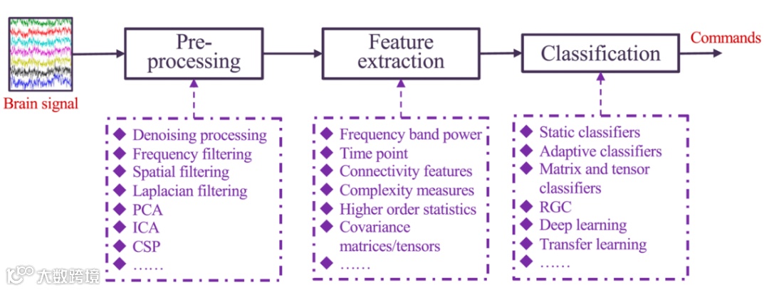解码技术:流程包括预处理、特征提取与分类。传统方法依赖静态分类器,而迁移学习通过跨个体、跨任务的知识共享,显著降低校准成本,提升泛化能力,成为当前研究重点。