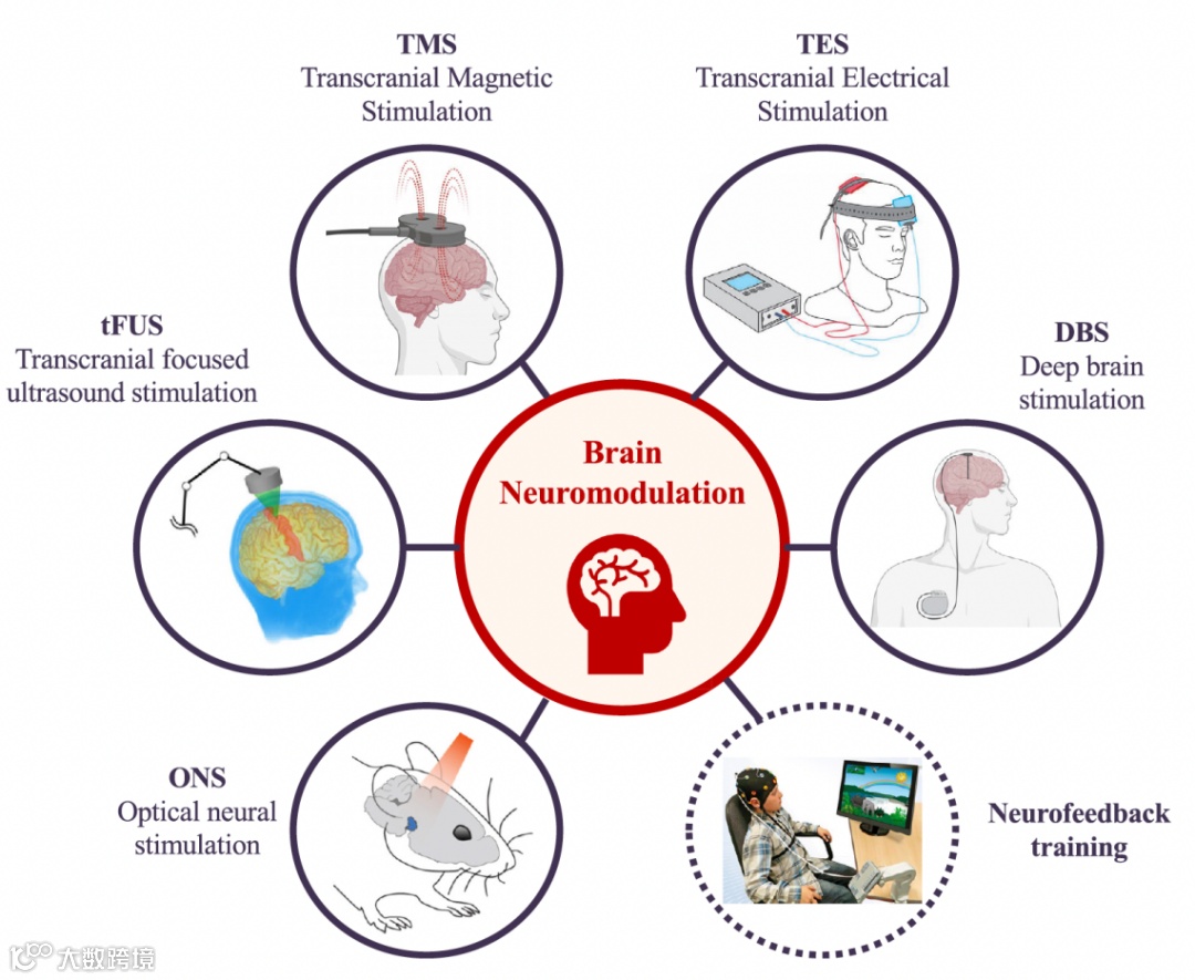 神经调控:实现C2B通信的关键手段,包括经颅电刺激(TES)、深部脑刺激(DBS)、经颅磁刺激(TMS)、聚焦超声(tFUS)及神经反馈训练(NFB),在康复治疗、情绪调节与人机增强中展现潜力。
