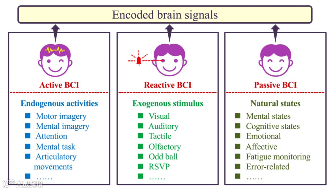 通信范式:脑机接口范式分为三类——主动型(如运动想象)、反应型(如P300、SSVEP)与被动型(如情绪监测),以及融合多种模式的混合型系统,提升鲁棒性与效率。