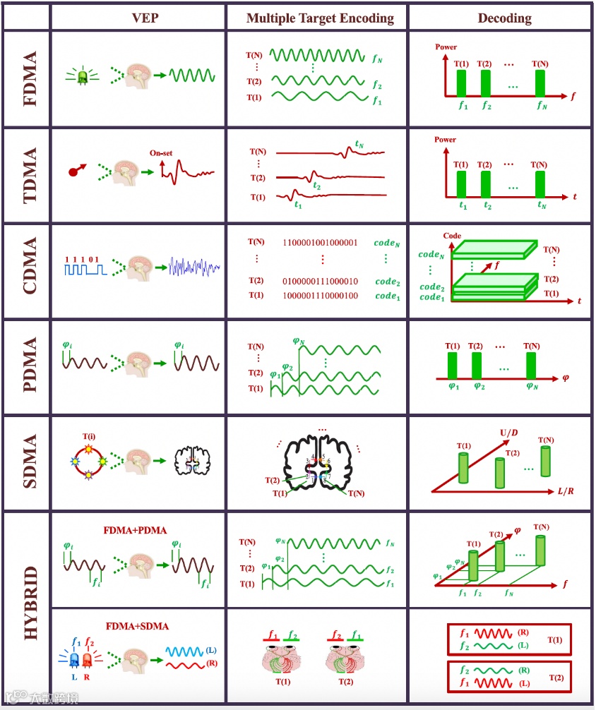 多址接入技术:借鉴通信系统中的多址策略,脑机接口通过频分(FDMA)、时分(TDMA)、码分(CDMA)、相分(PDMA)、空分(SDMA)及混合多址(HMA)等方式,实现多目标高效区分,显著提升信息传输速率(ITR)。