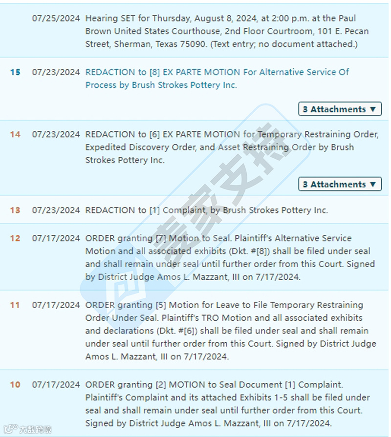 这是7月中旬的在东德州立案的一起TRO维权案,维权产品是来自Brush Strokes Pottery Inc工作室创作的发光陶瓷仙人掌,广受消费者喜爱的同时,Brush Strokes Pottery Inc在2019年-2024年间相继注册了多个版权。麦家支持友情提醒广大卖家朋友注意避雷,产品虽好,但未经授权上架,便会面临TRO侵权风险。目前该案件已于7月17日签署TRO冻结,并于8月2日申请了PI初步禁令,涉案卖家需及时处理,避免损失扩大化。