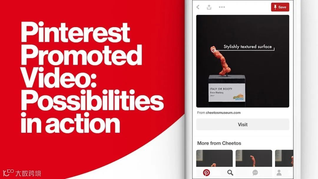 视频推广 Pins 和推广 Pins 基本一样,只是由静态图片变为动态影像。展示位置同样包括在:主页 Feed、搜索结果以及 Pin 功能"more like this"中。视频推广 Pins 会自动静音播放前50%部分,因此侧重于优化视觉效果,会吸引观众兴趣、带来更高的页面流量。