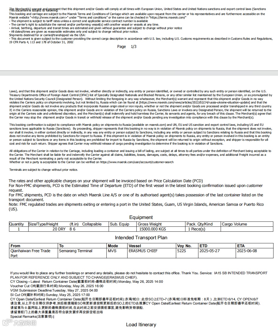 - 装运指令:明确货物所配船名、航次及截关时间。