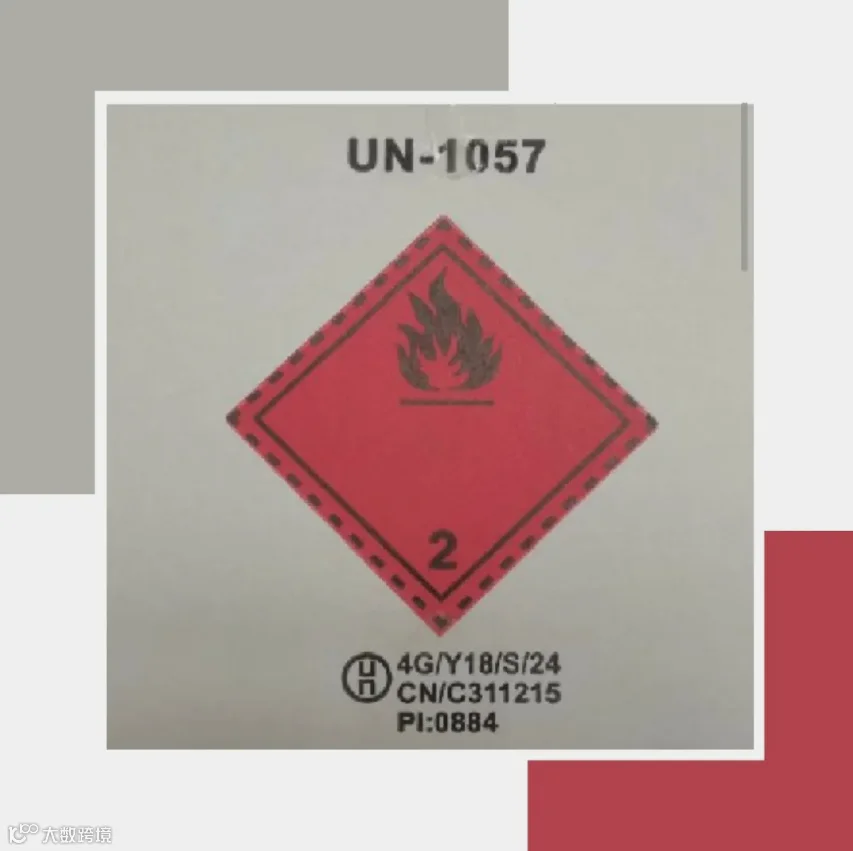 标识要求:外包装须标明企业登记代码、批号、UN编号(1057)、UN标记,并加贴2类易燃气体标志(火焰标志,尺寸不小于100mm×100mm)。