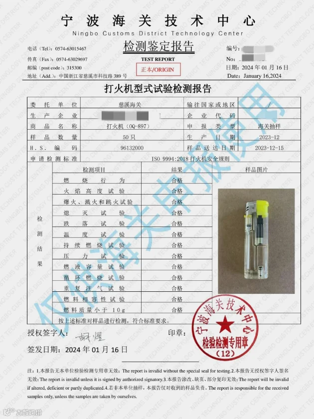 型式试验:首次出口或产品结构、材料、工艺变更时,须完成包括防儿童开启、燃烧高度、温度试验等12项全项检测。样品由海关从成品仓库随机抽取,检测合格后出具报告。金属外壳产品有效期为12个月,塑料外壳为9个月。