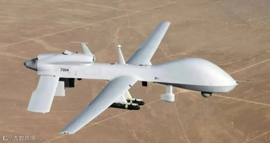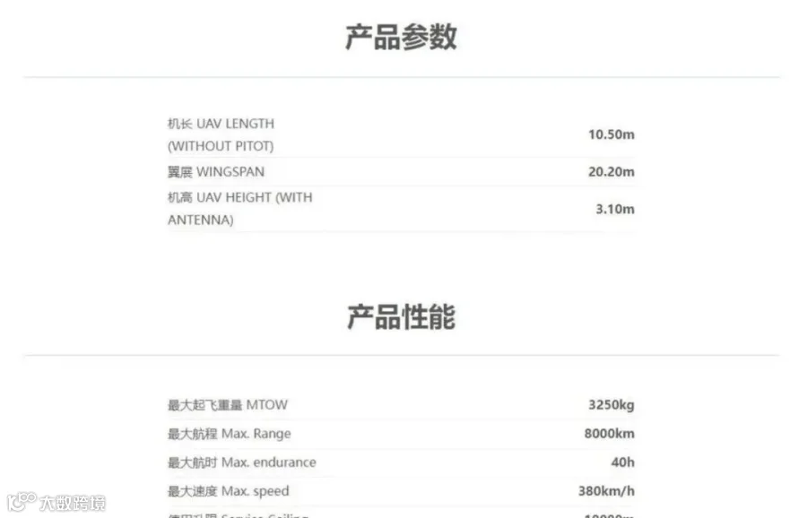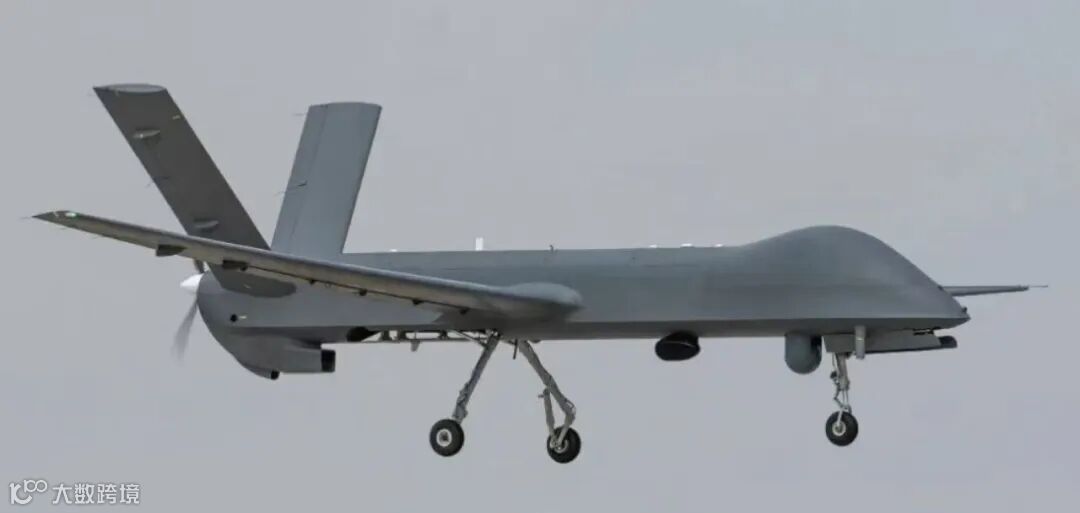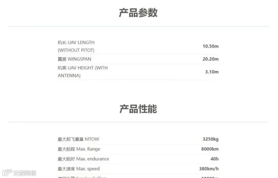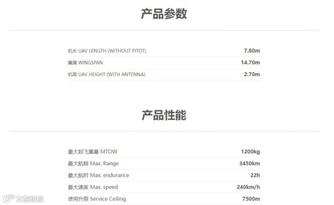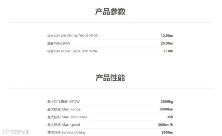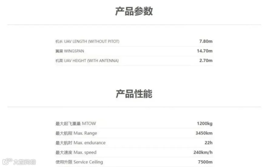 大型侦察打击一体化无人机,最大起飞重量3.2吨,任务载荷1.2吨,续航45小时,实用升限8000米。