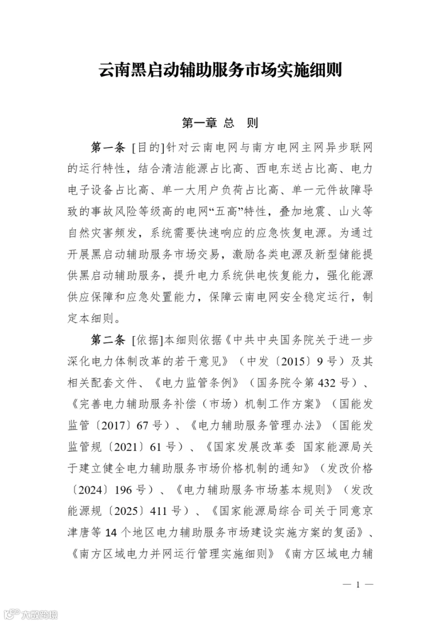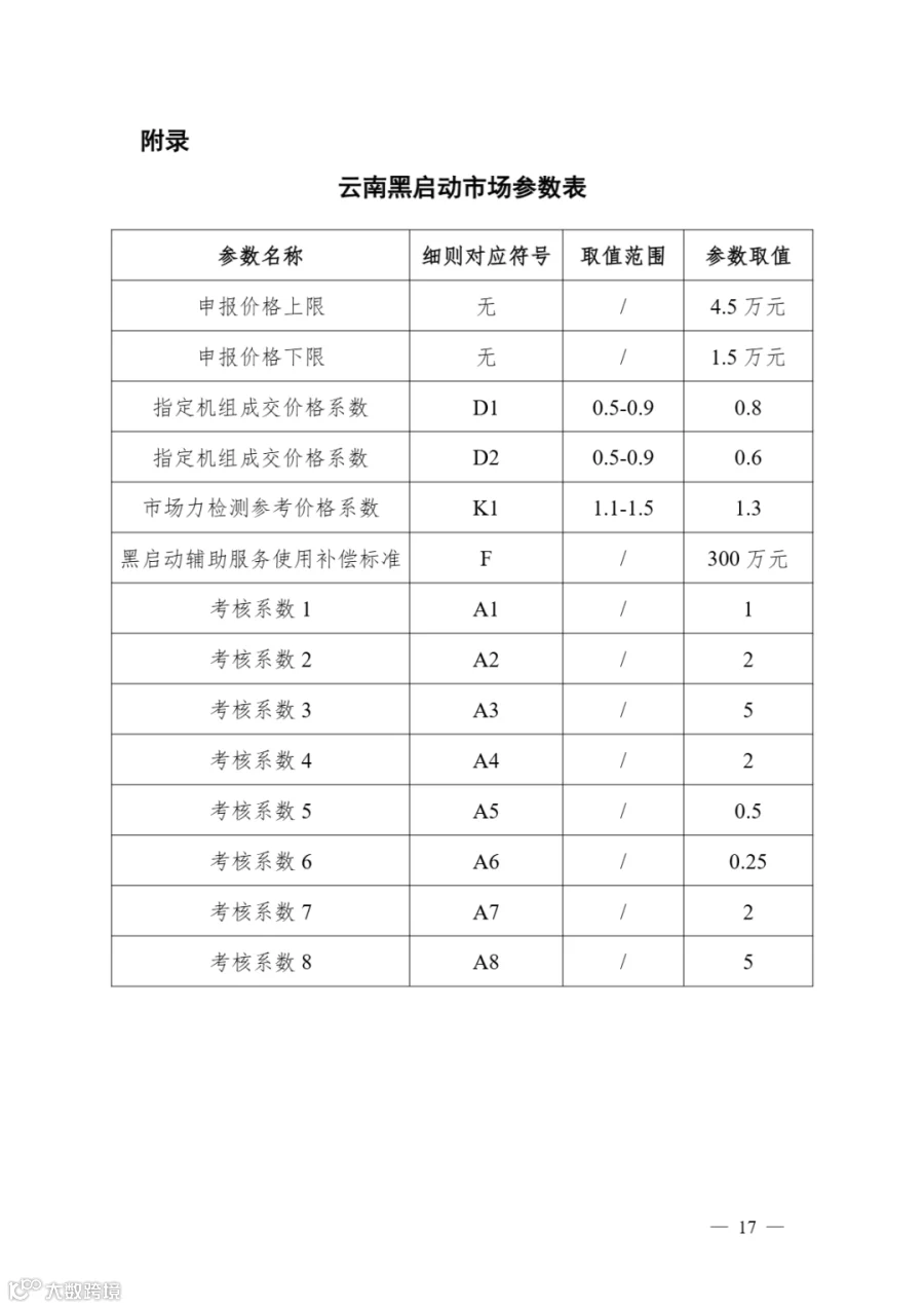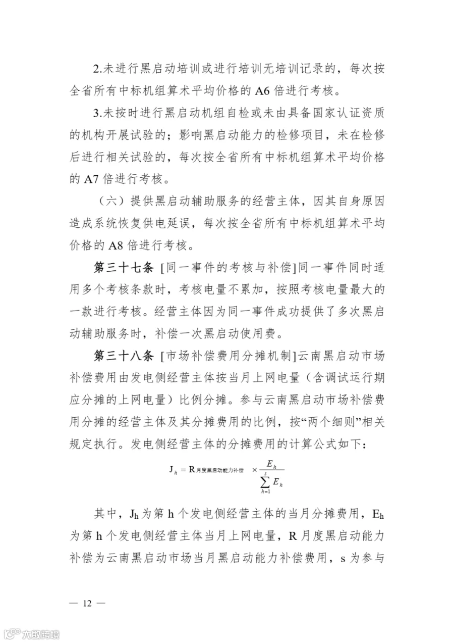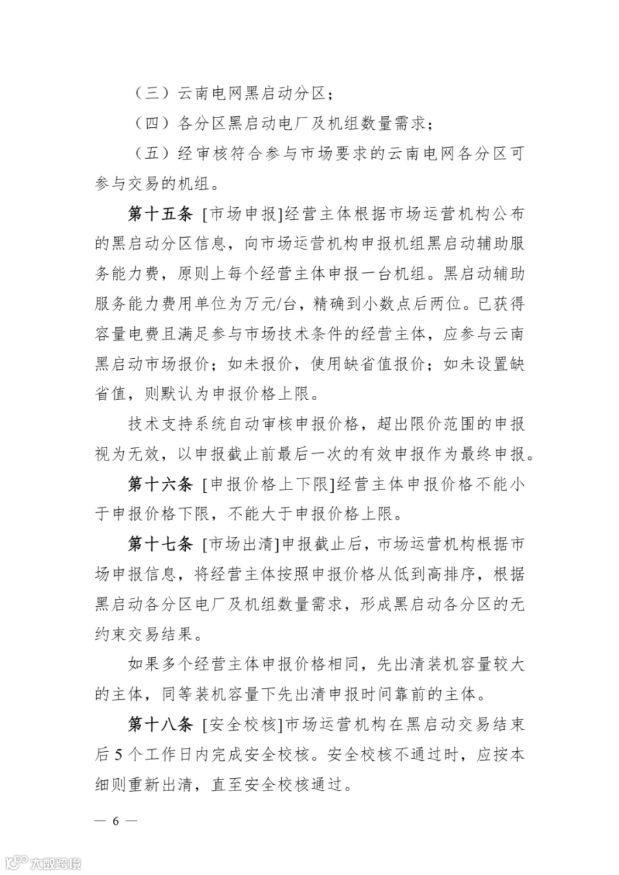 《云南黑启动辅助服务市场实施细则》明确: