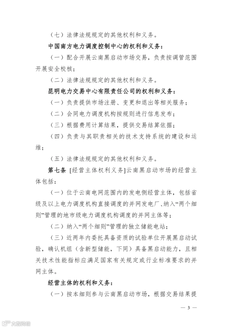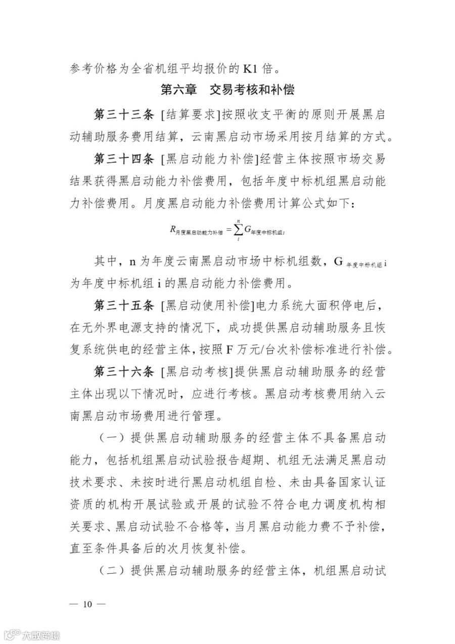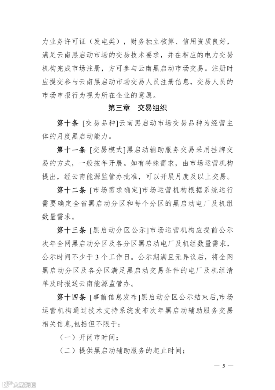 《云南黑启动辅助服务市场实施细则》明确: