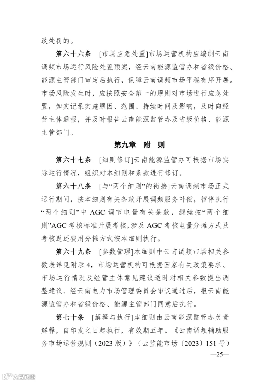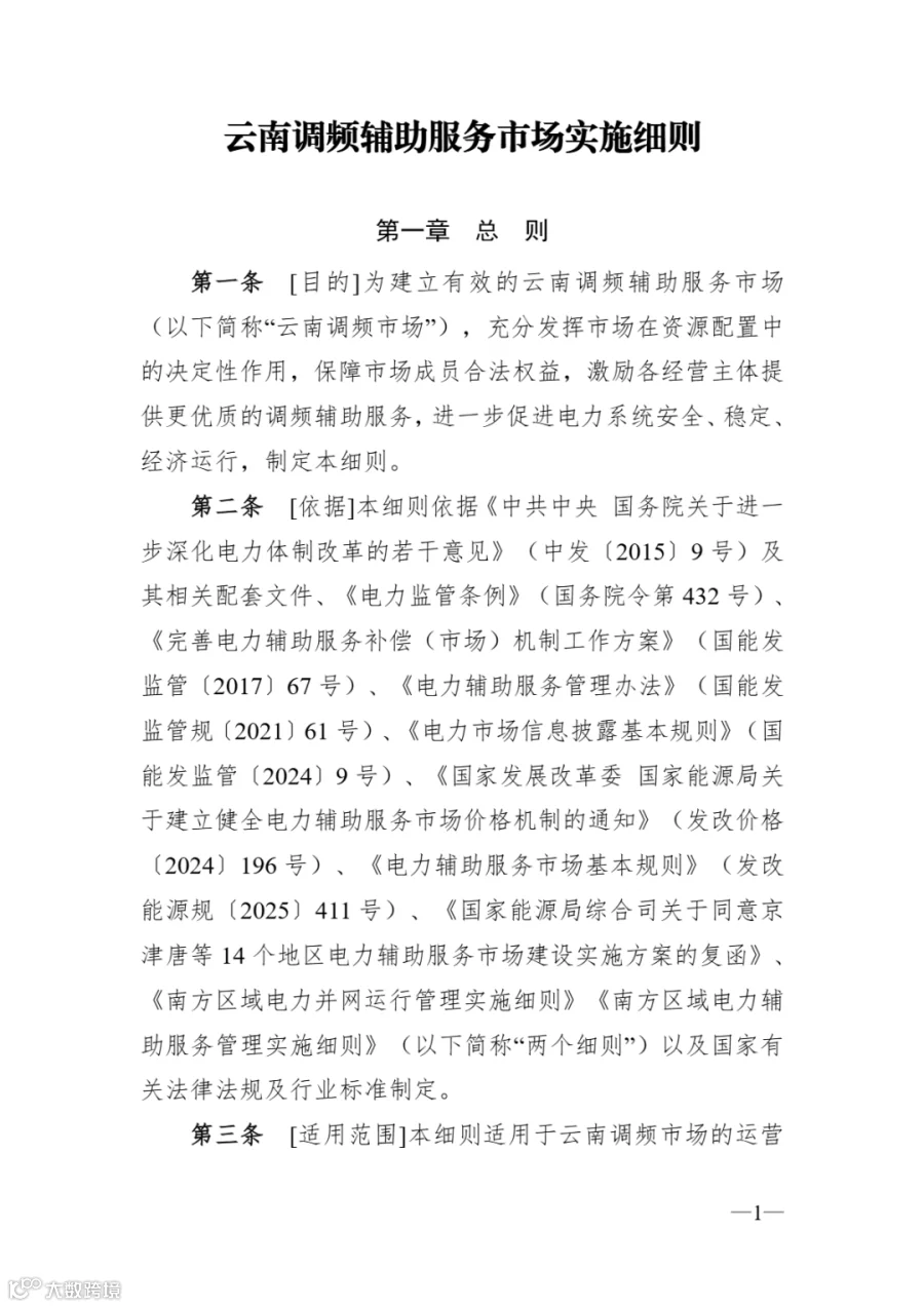 为深入贯彻党中央、国务院重大决策部署,落实国家发展改革委、国家能源局《关于建立健全电力辅助服务市场价格机制的通知》(发改价格〔2024〕196号)、《电力辅助服务市场基本规则》(发改能源规〔2025〕411号)等有关工作要求,持续优化完善电力辅助服务市场相关机制,促进新型电力系统健康有序发展,结合市场运行实际,云南能源监管办会同有关单位组织修编了《云南调频辅助服务市场实施细则》《云南黑启动辅助服务市场实施细则》,现予以印发,并就有关事项通知如下,请一并贯彻执行。