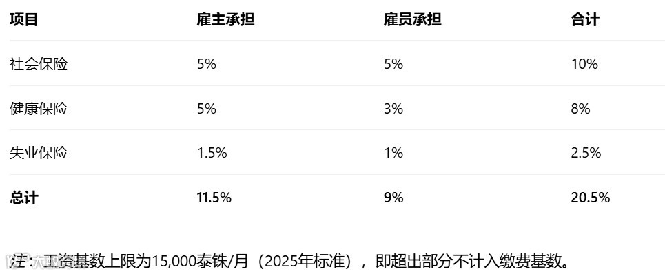 泰国社会保险基金(Social Security Fund, SSF)为强制性制度,适用于所有泰国籍雇员(含试用期员工),由雇主与雇员共同缴纳。