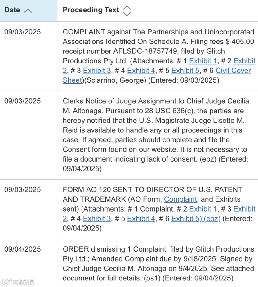 2025年9月,澳大利亚动画与数字内容公司Glitch Productions Pty Ltd在美国佛罗里达州南区联邦法院提起商标侵权诉讼,代理律所为TME Law, P.C.,案件编号25-cv-24002 / 25-cv-24001,当前状态为Open(已立案)。