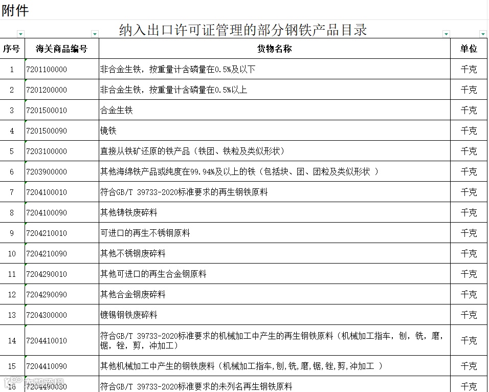 像非合金生铁、再生钢铁原料、钢铁粉末等都在列,这里特别提醒一下,再生料还得符合GB/T 39733-2020标准。