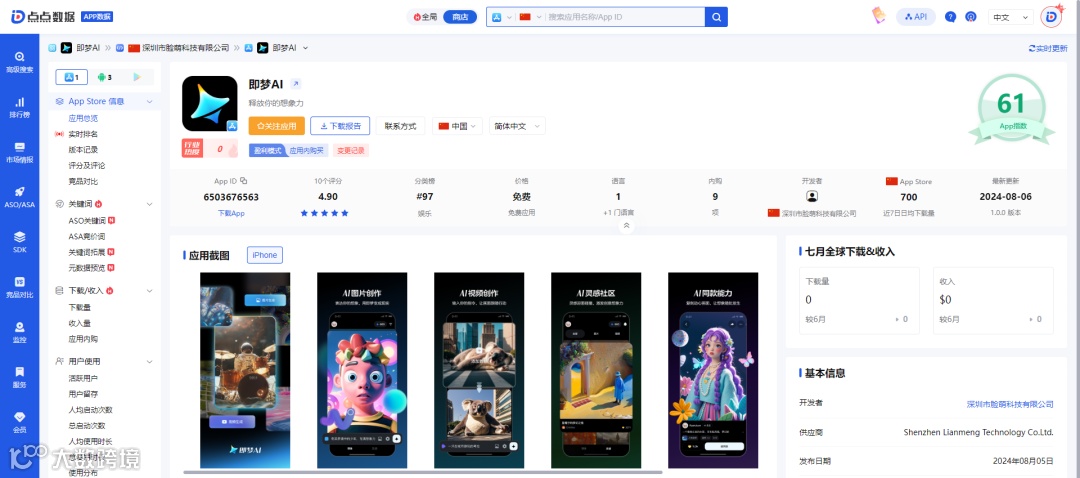 8月6日,字节跳动宣布推出一款名为“即梦 AI”的一站式AI创作平台。该平台目前已经上架到苹果App Store和安卓各大应用商店。