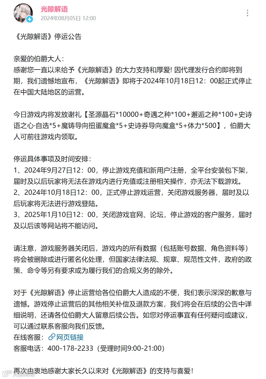 11 哔哩哔哩代理手游《光隙解语》国服今年 10 月 18 日停运,去年 9 月公测