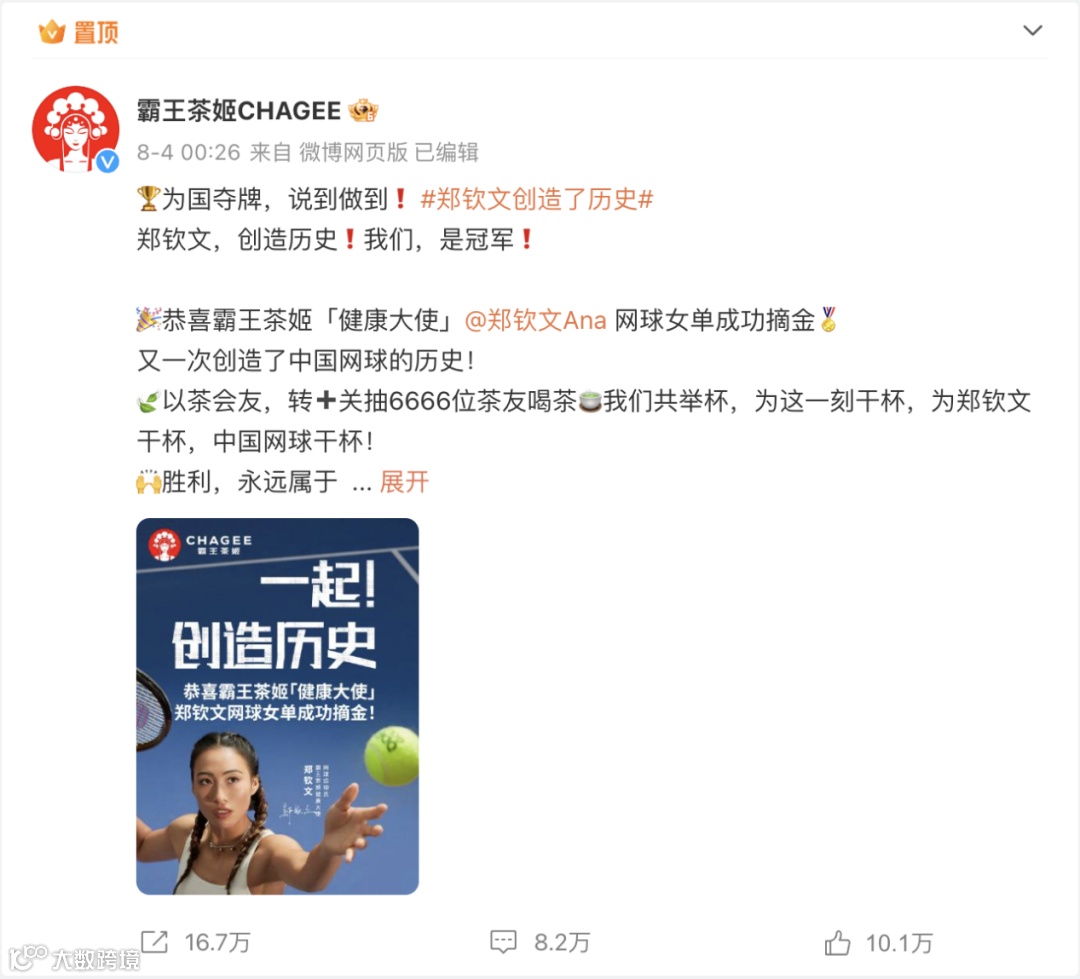 霸王茶姬接住了这一泼天的流量。8 月 4 日,霸王茶姬官方微博“霸王茶姬CHAGEE”发了一条微博,恭喜郑钦文“创造历史”。
