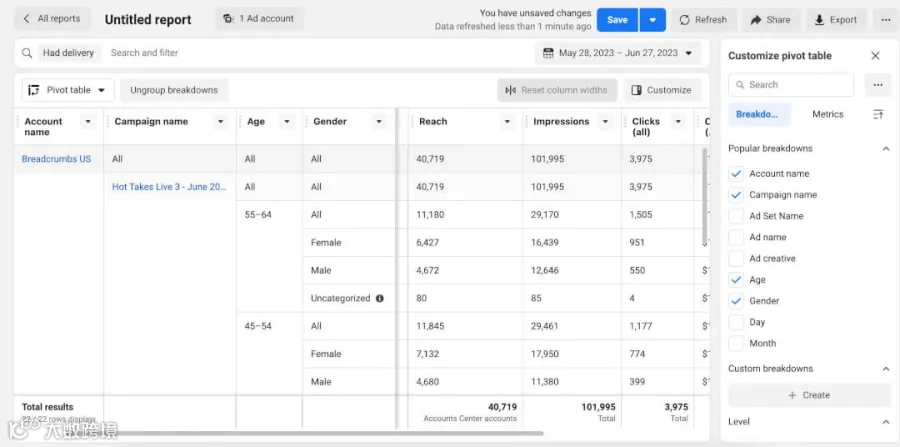 Meta 广告管理工具中的“广告报告”版块可以帮助你查看广告系列的投放效果。在这里,广告商可以根据自己的需求定制报告,从基本点击次数和展示次数中选择相关指标,然后选择更详细的数据,如转化率和广告支出回报率 (ROAS)。