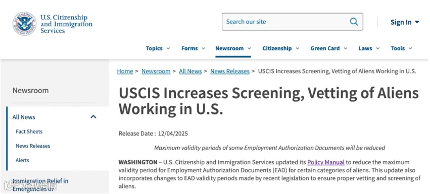 2025年12月5日,美国移民局正式实施工卡新规,将多数类别申请人的工卡最长有效期从5年压缩至18个月,涵盖以下群体: