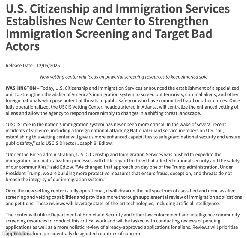 同样在12月,美国移民局USCIS 宣布:在亚特兰大成立一个全新的“Vetting Center 审查中心”,美国移民系统将正式进入 AI+大数据深度审查时代,以后所有移民申请,都要被“智能放大镜"查一遍。