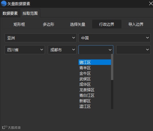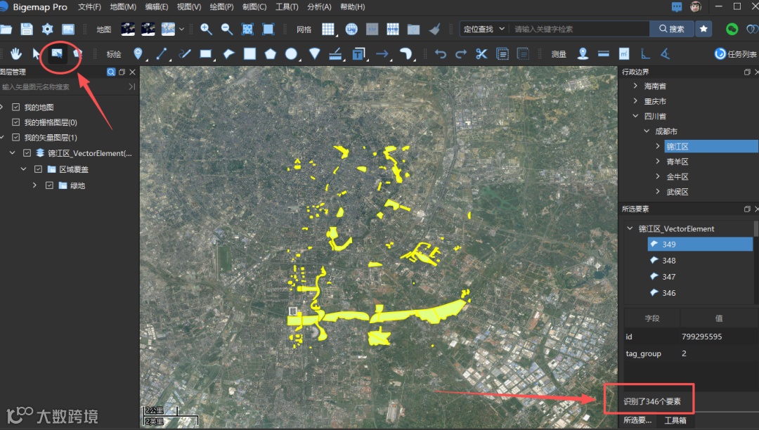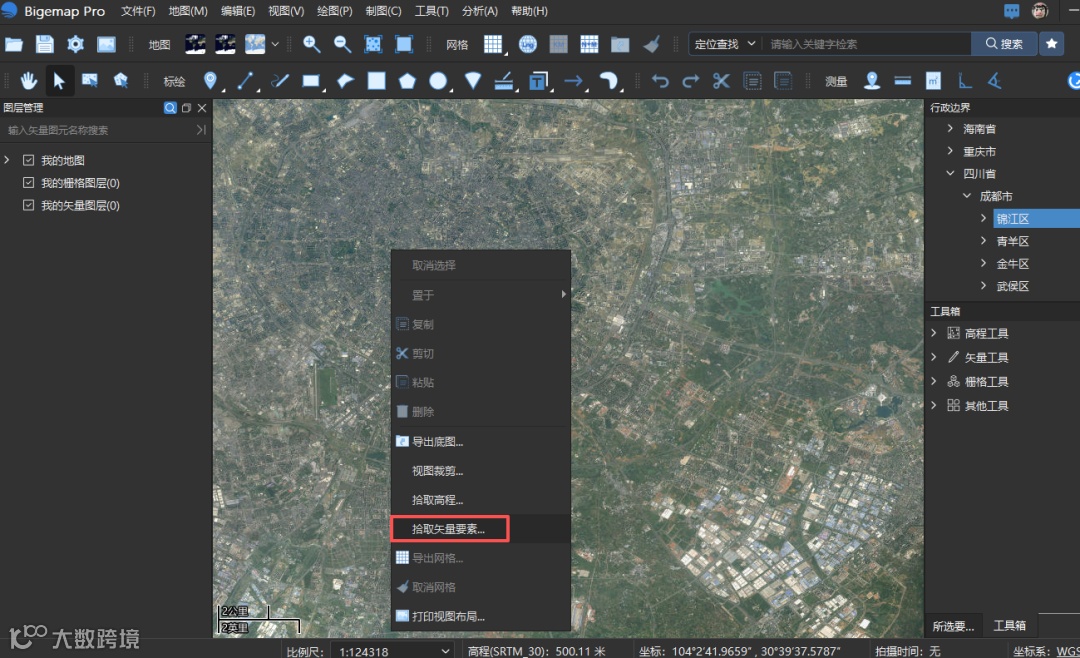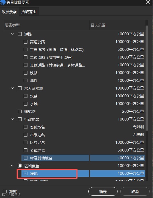 在Bigemap Pro中,右键地图选择“拾取矢量要素”,勾选【绿地】类别,通过行政边界划定目标区域。系统自动加载绿地斑块图层后,可在【我的矢量图层】中查看。