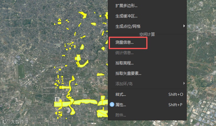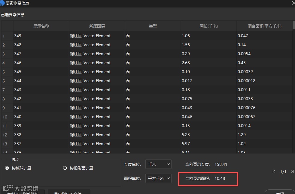 框选所有绿地斑块,右键选择【测量信息】,在弹出窗口中查看“当前页总面积”,注意单位设置为平方千米(km²),该值即为Ai。