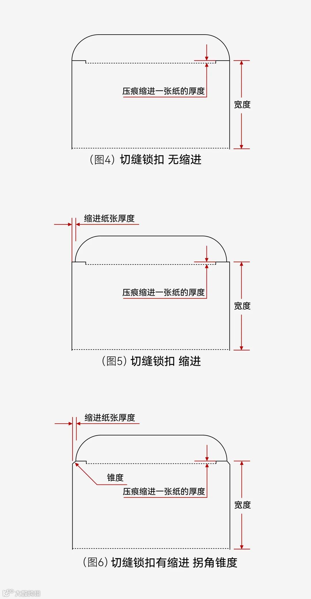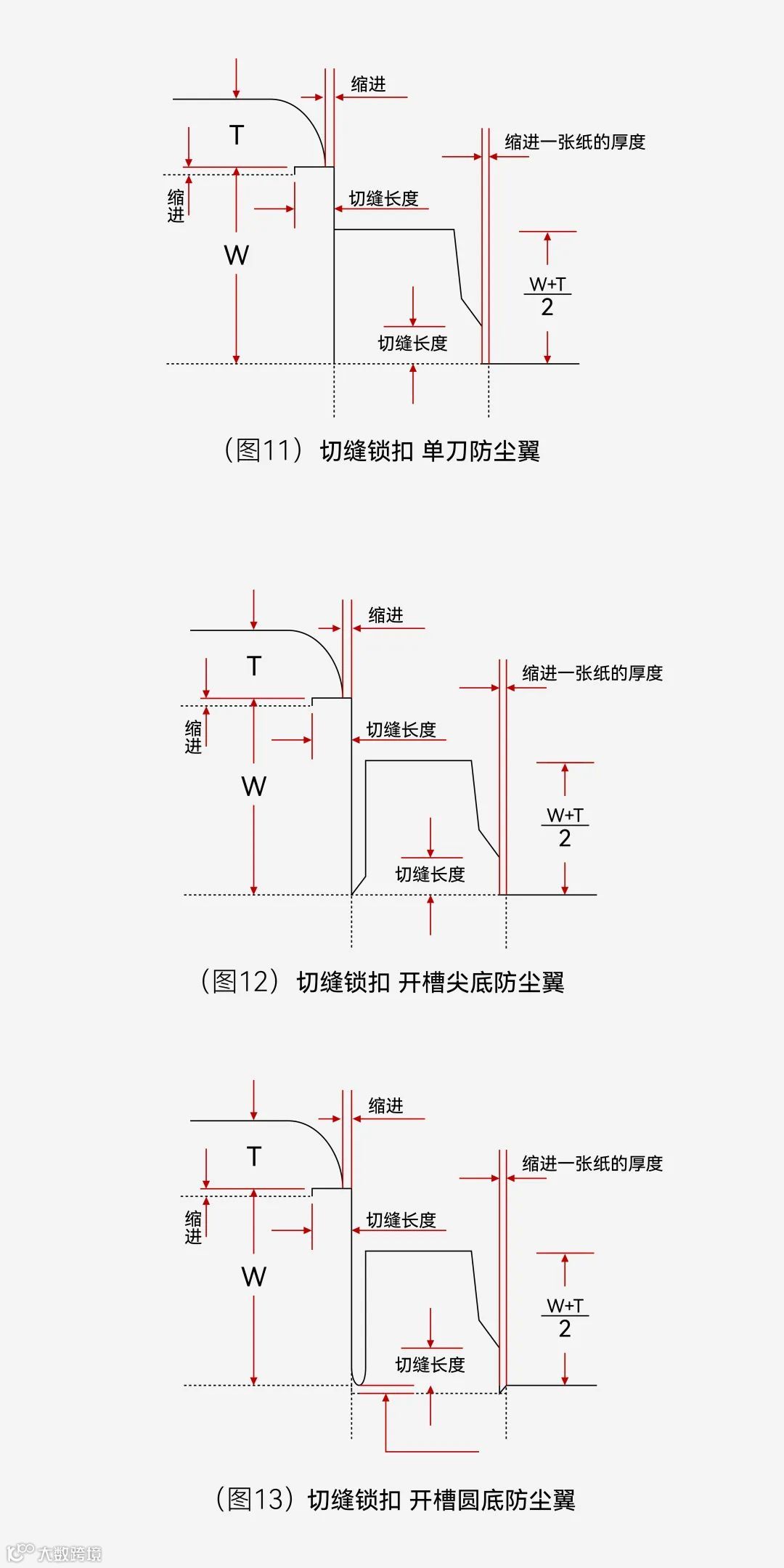 (图11)是切单刀,(图12)和(图13)是开槽的方式。需要注意的是:当纸张比较厚的时候,防尘翼的压痕线要与盒盖的压痕有一定的偏移,目的是防止防尘翼对盒盖挤压导致扭曲、变形,甚至纸张爆裂(图13)。