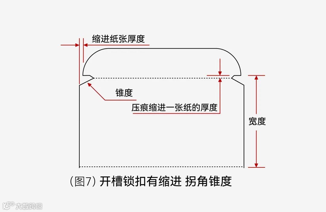 通过插舌两边切一条缝,插入后与防尘翼形成锁合,这种结构盒盖不容易弹开,但是要特别注意压痕的缩进量,一张纸的厚度即可,(图4)缩得太多盒盖开启比较困难。盒子比较大的时候,纸张厚,插舌两边缩进多(图5),盖子与插舌有一个明显的拐角,容易在仓储、搬运、生产过程中碰撞变形,所以有的客户要求“削平”这个角,(图6)因此会做一个斜的锥度。