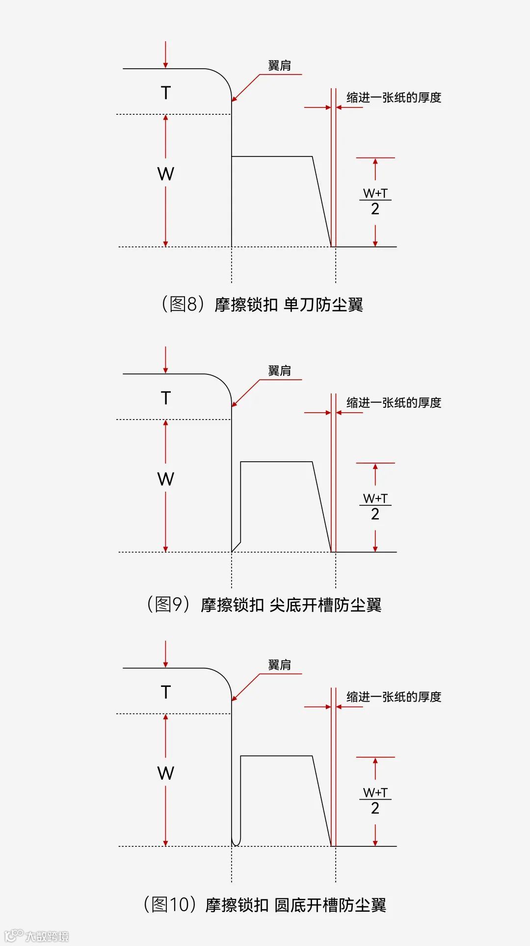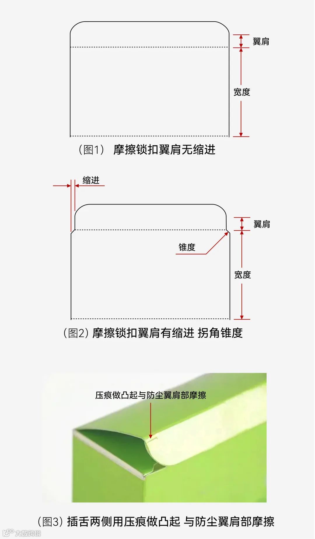 摩擦式锁扣的特点是插舌的左右两边,圆角到折痕之间有肩膀,我们称之为“翼肩”(图1)。
