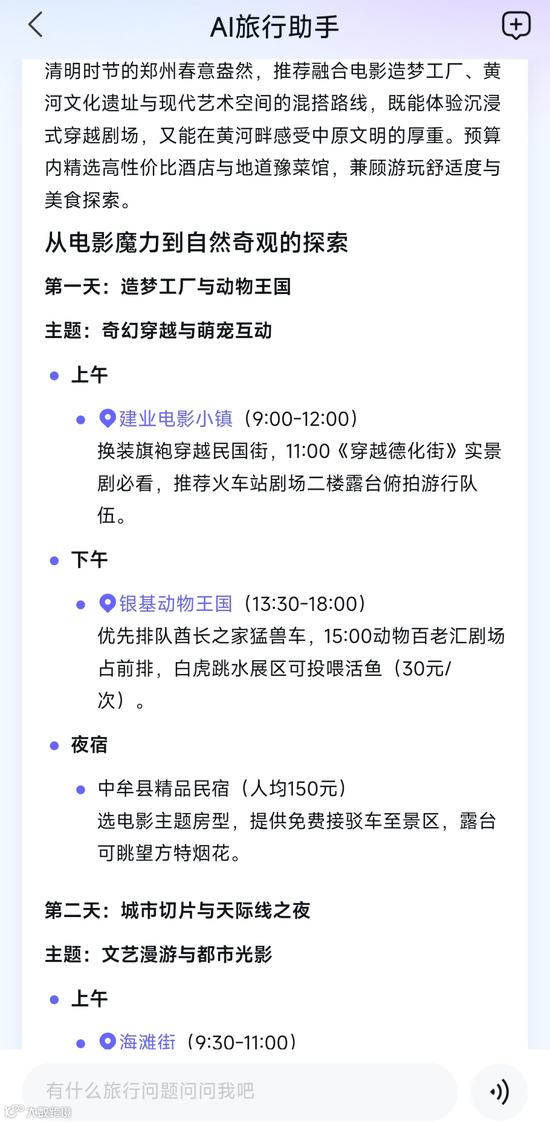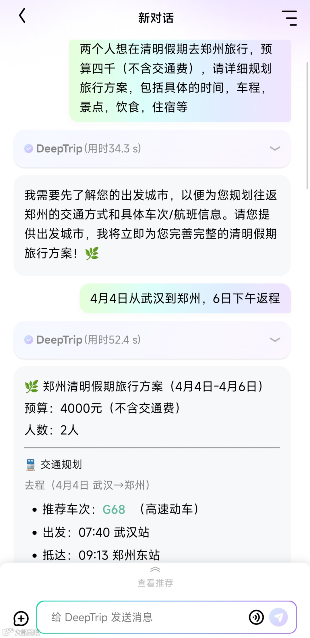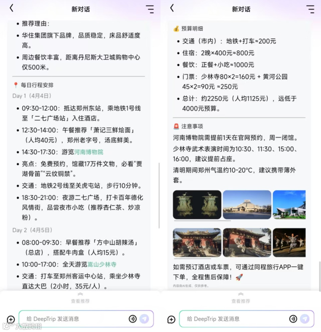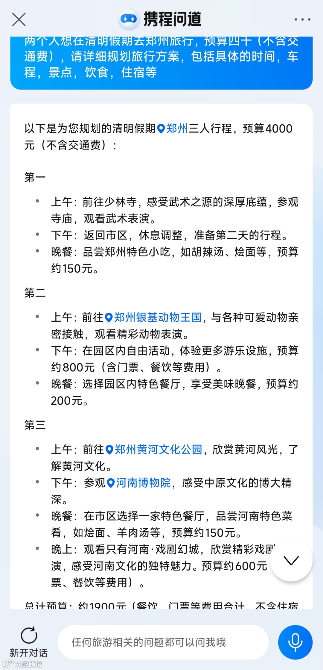为了测试AI旅行规划助手的理解力,我们以一个稍全面的问题入手,询问AI:“清明假期两个人去郑州旅行,预算四千(不含交通费),请详细规划旅行方案,包括具体的时间,车程,景点,饮食,住宿等”。