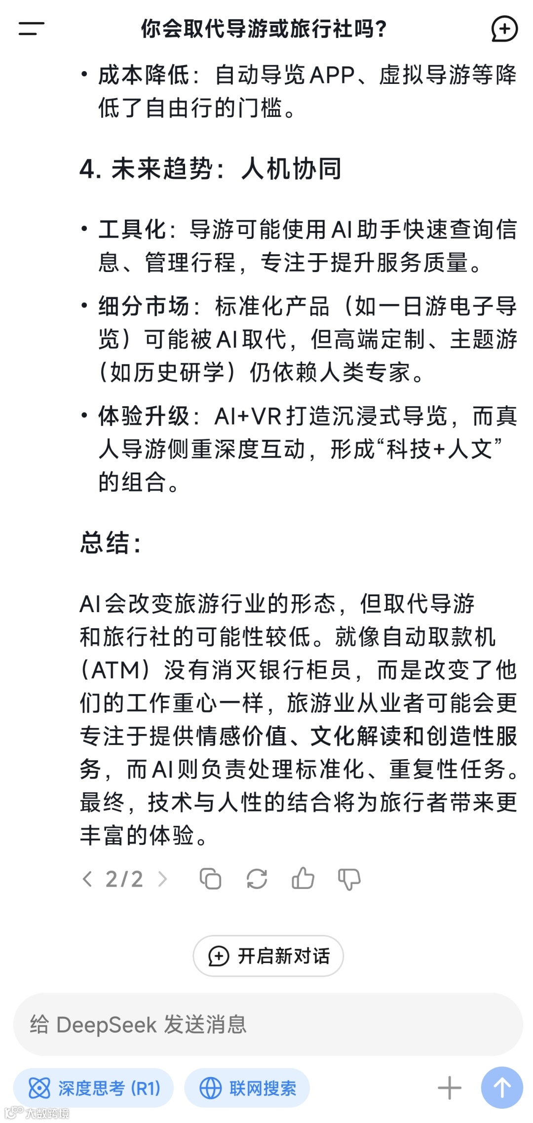 DeepSeek给出的回答是:AI会改变旅游行业的形态,但取代导游和旅行社的可能性较低。就像自动取款机(ATM)没有消灭银行柜员,而是改变了他们的工作重心一样,旅游业从业者可能会更专注于提供情感价值、文化解读和创造性服务,而AI则负责处理标准化、重复性任务。