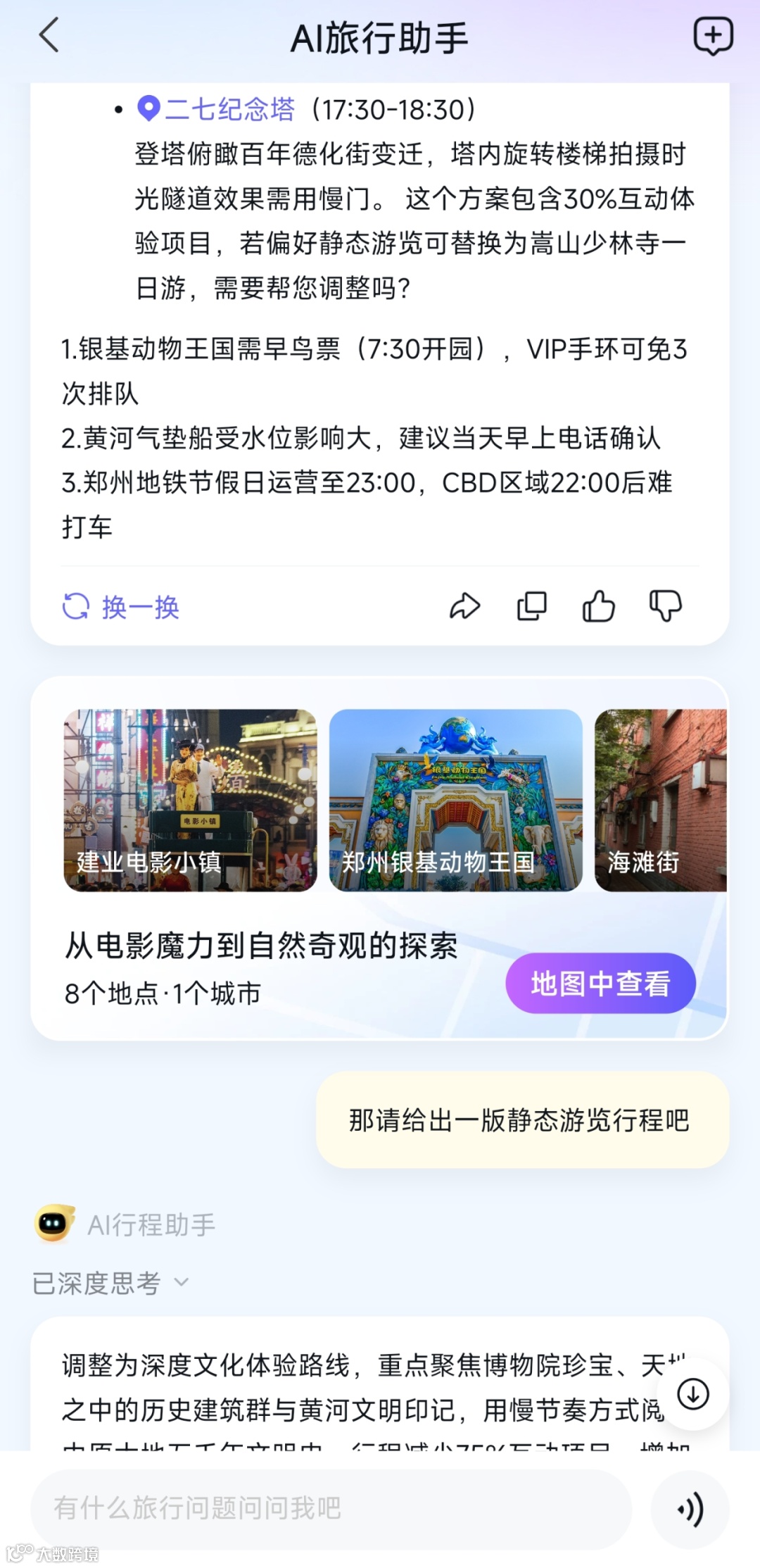 在最后AI还主动提出,这个方案包含30%互动体验项目,若偏好静态游览可替换为嵩山少林寺一日游,在得到我们的许可后,又推荐了一版以古建鉴赏和山水写生为主的路线。