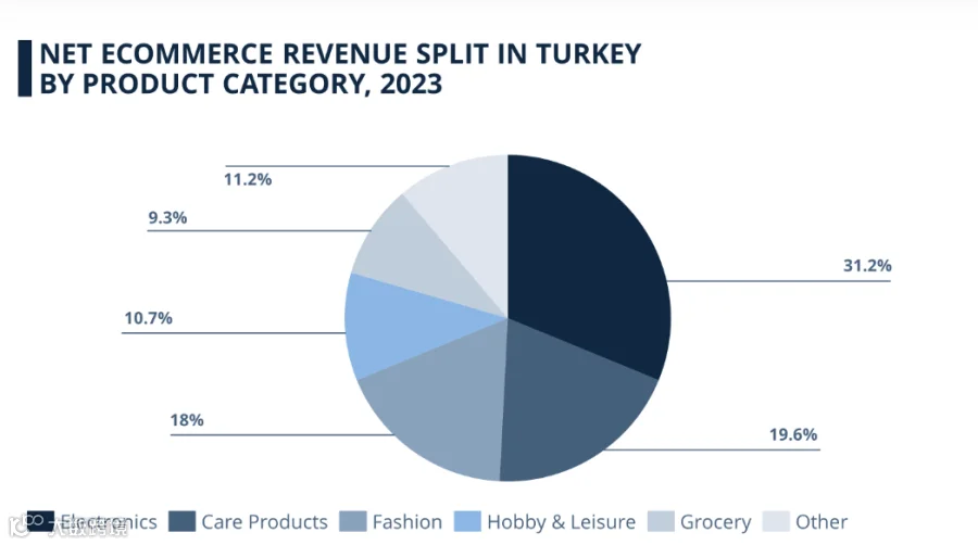 电子产品是土耳其电商行业最受欢迎的品类,占土耳其电子商务收入的 31.2%。紧随其后的是个人护理产品,占收入的 19.6%。第三是时尚类目,占 18%。其次是爱好和休闲(10.7%)、杂货(9.3%)、DIY(6.6%)和家具及家居用品(4.6%)。