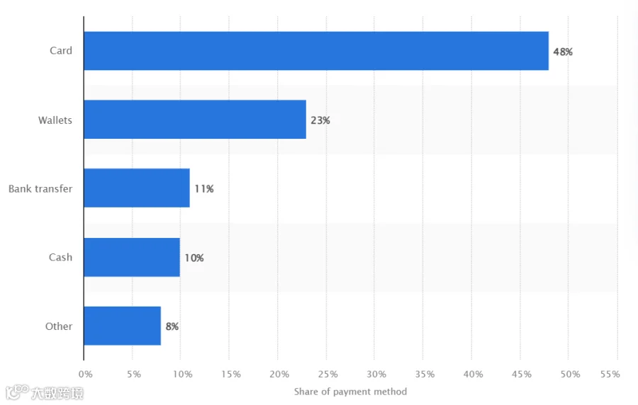 海湾六国消费者最常用的在线支付方式是信用卡支付,约占 48%。其次是钱包(23%)。最常见的信用卡是 Visa。