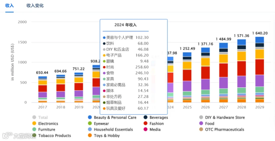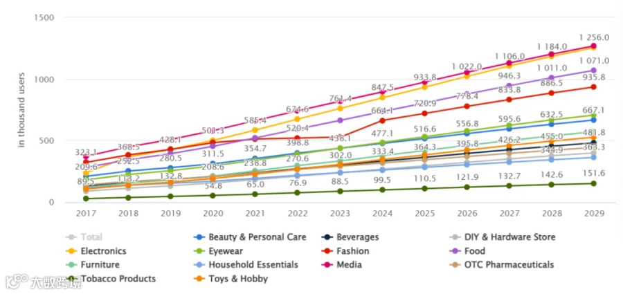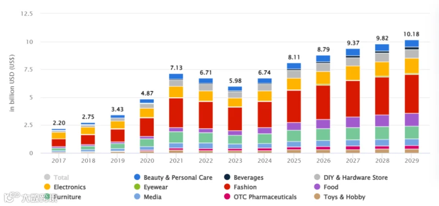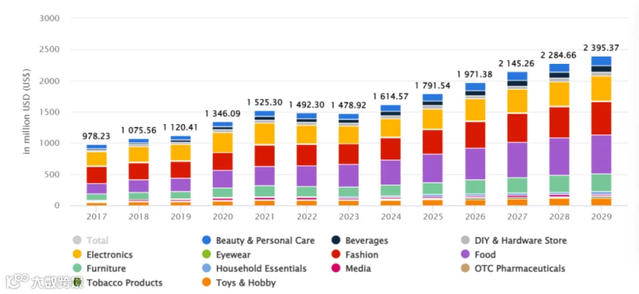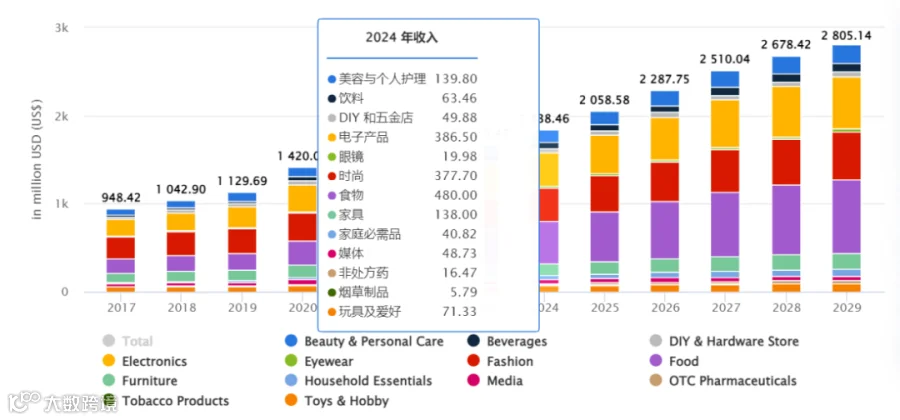 2017-2029年阿联酋电子商务收入总量及各渠道占比, Statista Market Insights