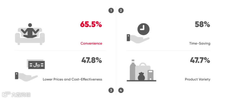 伊朗消费者网购的四大因素:便利(65.5%)、节省时间(58%)、价格低廉(47.8%)、成本效益高(47.7%)。