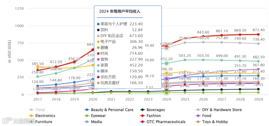 2024年阿联酋电商各渠道收入(平均每户),Statista Market Insights