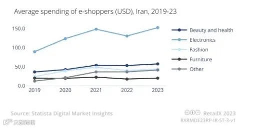 伊朗电子商务市场中七大商品类目十分受欢迎,休闲是最大的市场,占伊朗电子商务收入的 23.5%,其次是电子产品(22.3%)、时尚(17.7%)、家具及家居用品(11.8%)、护理产品(8.8%)、DIY(8.1%)和杂货(剩余的7.8%)。