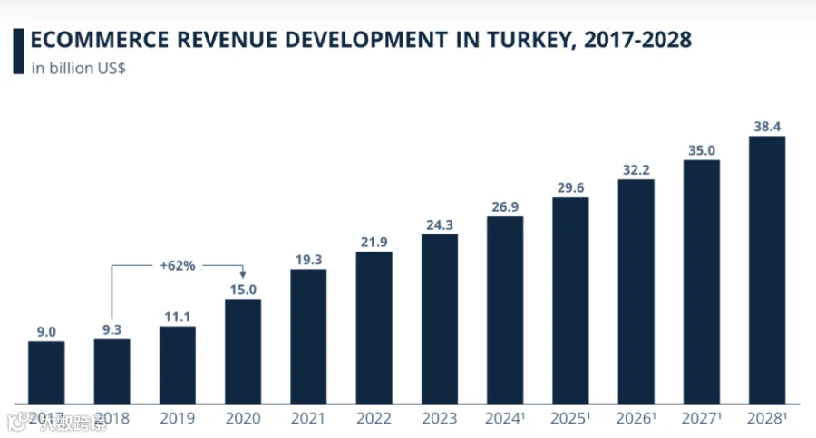 土耳其拥有4084万电子商务用户,2023 年电商市场规模为240亿美元,预计到 2028 年将达到380亿美元。在土耳其网购消费者中,约有45.5%的人通过手机购物。稳定的电商收入增长与广泛的网购偏好,让土耳其成为中东地区最大的电子商务市场。