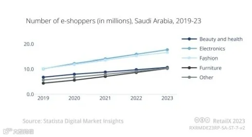 在沙特,时尚市场,占沙特阿拉伯电子商务收入的33.9%。其次是电子产品(26.9%)、食品和个人护理(23.0%)、玩具、爱好和DIY(9.2%)、家具和电器(7.0%)。前两个品类的线上支出占总金额的60%以上。平均每个沙特消费者每年在美妆个护上的花销为210.5美元。