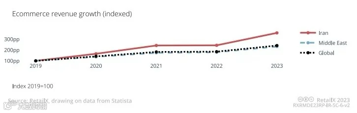 2020年至2023年,伊朗电商市场以28%的增长率一路领跑,成为中东地区增速最快、增长率最高的电子商务市场。电子商务交易总额显著增长 75%,达到 13400 万亿伊朗里亚尔(257 亿美元)。