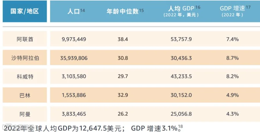中东地区22个经济体,其中尤属海湾六国(阿拉伯联合酋长国、沙特阿拉伯、阿曼、巴林、卡塔尔、科威特)的发展最为迅猛。根据国际货币基金组织2023年的最新数据显示,海湾六国人均GDP在4.22-12.48万美元之间,均位于发达国家基准线(人均GDP两万美元)之上。此外,海湾六国30岁以下人口占比60%至80%,人口年轻化;互联网普及率在90%以上。