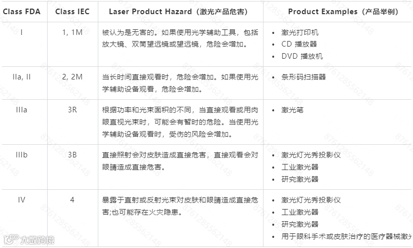 类别标识,从Class I到IIIa。Class IIIb和IV产品应仅由接受过适当培训的人员使用,并且仅在确实需要这些高功率产品的应用中使用。