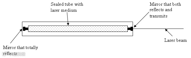 密封管道的两端各有一对镜子,反射或透过光线,形成一束集中的光流,称为激光束(见下图)。每种激光介质产生的光束具有独特的波长和颜色。