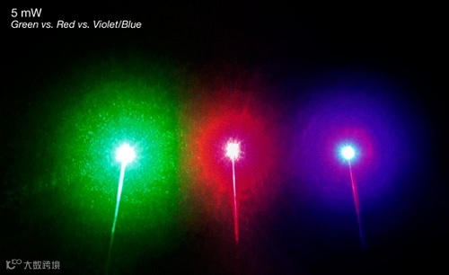 不是。不要以为激光束的颜色亮度表明其功率。在有光条件下(室内或室外),强激光的光束看起来可能与功率较小的激光束亮度相同或更暗。例如,在下图中,绿色激光束看起来比红色亮得多,比蓝色亮得更多。实际上,这些激光的功率相同,直接看这些激光束都会对眼睛造成同样的危害。如果你看到亮度与绿色激光类似的蓝色或紫色激光束,你可以放心地认为蓝色/紫色激光的功率要大得多,直接看入光束会导致严重且立即的眼睛损伤。