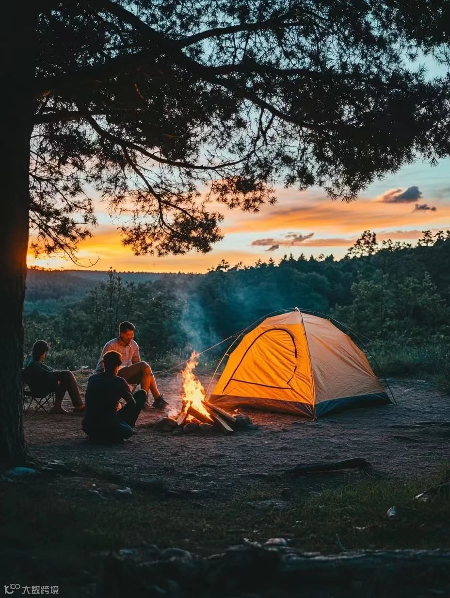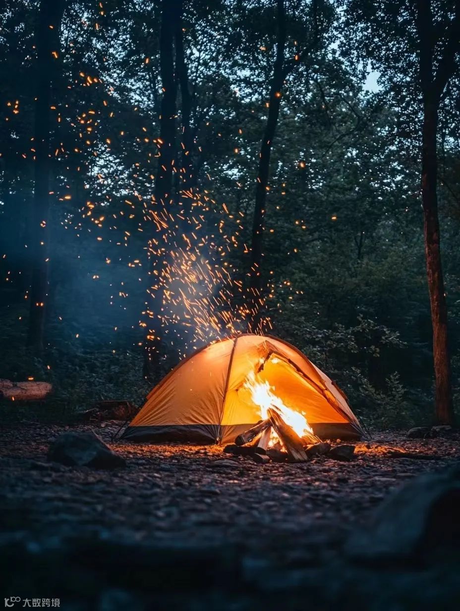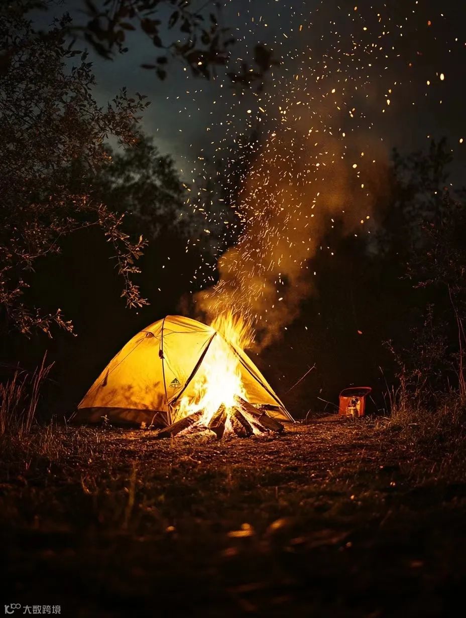 提示词:户外露营 :11,照片级别,实拍,帐篷::10,傍晚篝火 --ar 3:4