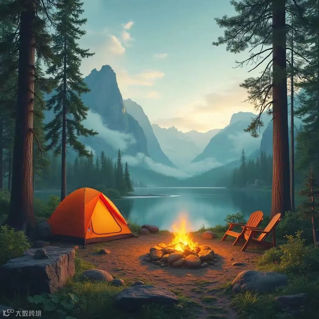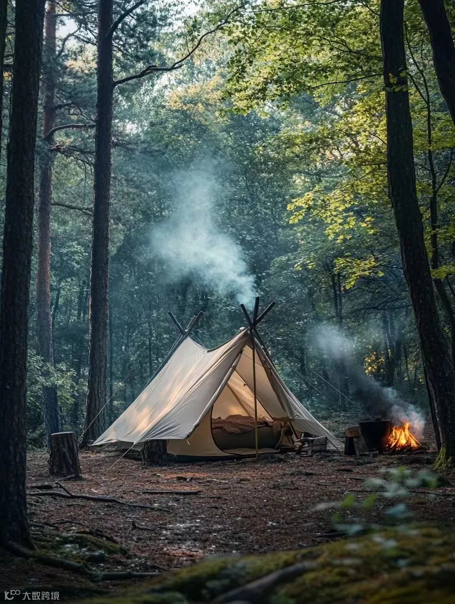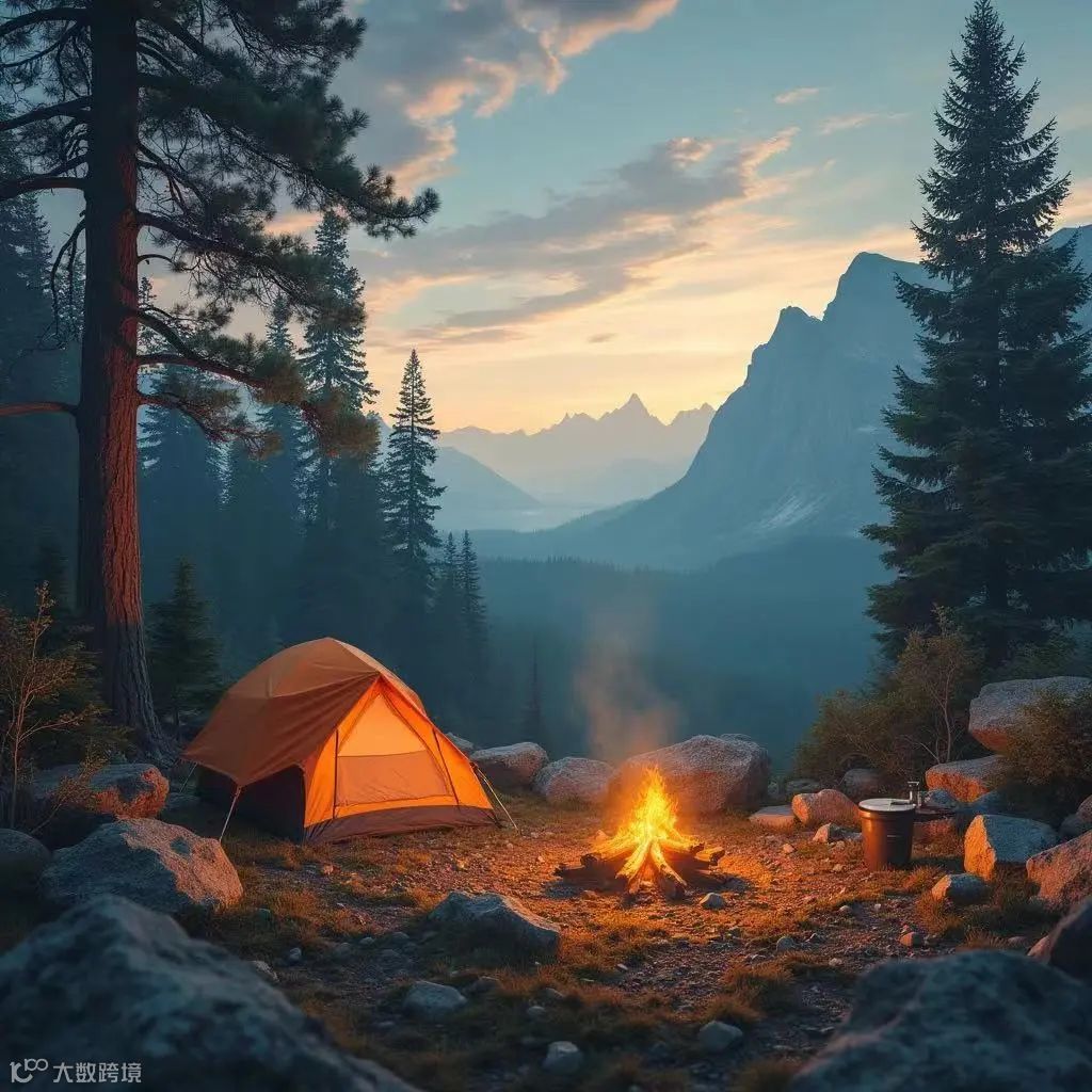 提示词:户外露营 :11,照片级别,实拍,帐篷::10,傍晚篝火 --ar 3:4