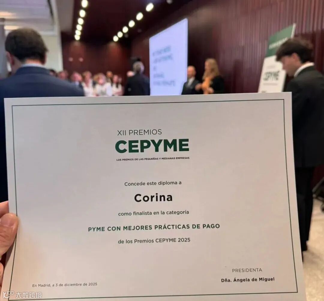 这是华人企业首次进入CEPYME大奖核心榜单,具有里程碑式意义,不仅标志着CORINA在西班牙主流商业体系中获得高度认可,也体现了华人企业在规范治理、商业信用与可持续经营方面迈入全新阶段。
