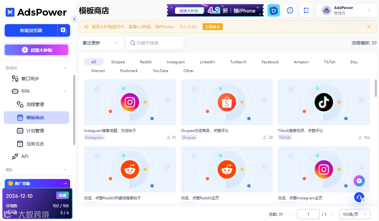 AdsPower 还支持在一台设备上批量完成登录、任务跟进、提现等操作,无需反复切换设备;针对看广告等耗时任务,其 RPA 自动化功能也很实用,可以提前设置定时启动与操作步骤(自动登录、打开广告页、看完切下一条),不用盯屏也能避免漏任务。