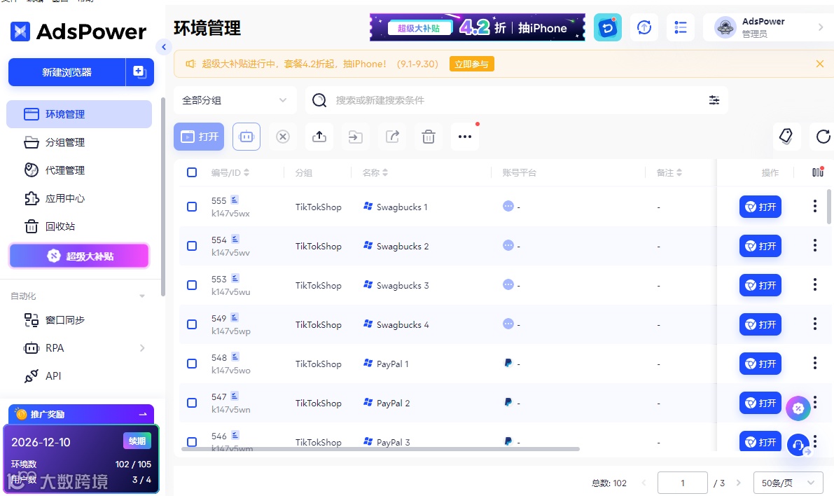 不过多账号操作的核心难题是 “关联封禁”—— 平台识别到多账号来自同一设备 / IP 会判定违规,此时可借助 AdsPower 指纹浏览器解决:它能为每个 Swagbucks 账号(及 PayPal 等提现工具)独立配置浏览器指纹与 IP,实现 “一账号一隔离环境”,从根源上杜绝关联。